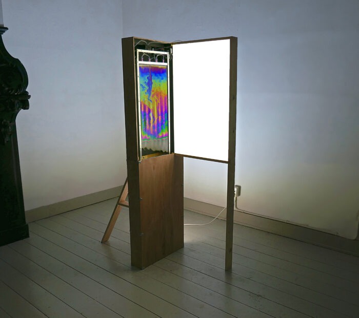 Fluently dynamical is an installation where delicate soap films dance to the symphony of sound waves, painting vivid color images with their fluid movements. These intricate patterns are not merely visual; they are living, breathing entities, caged within the resonant frequencies of the film. The accompanying sound composition, is made from sine waves tuned to these resonances, serving as both conductor and accompaniment. Through small modulation the sound explores the rich tapestry of natural harmonics and overtones. The result is a captivating display of visuals that seamlessly oscillate between captivity and freedom.
